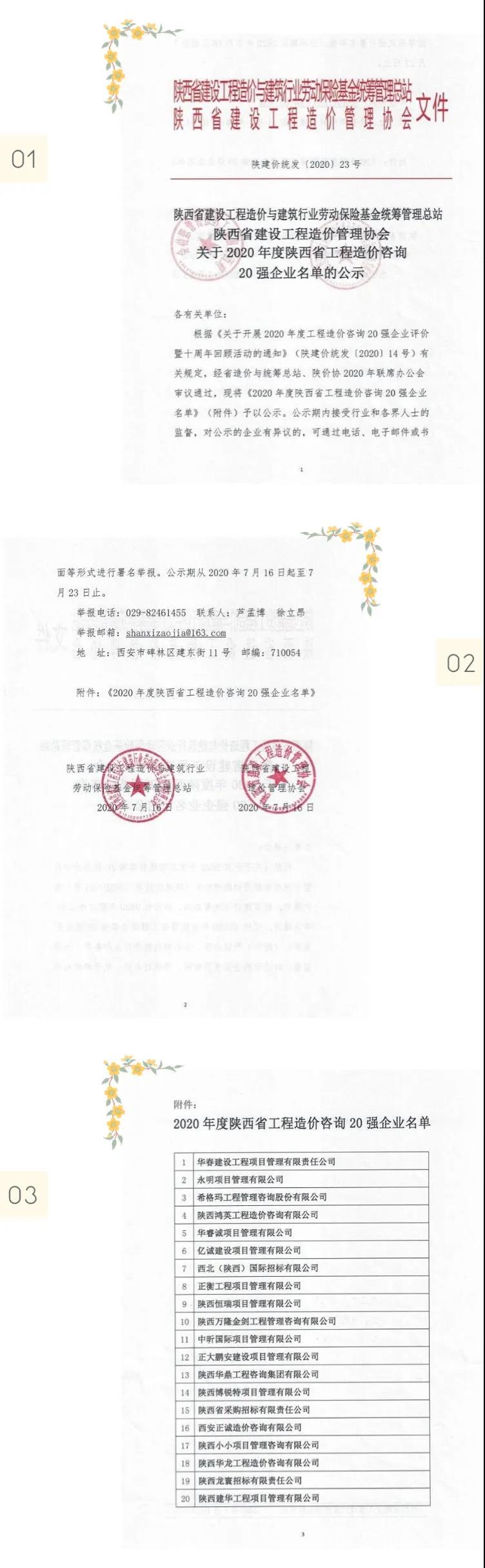 2020年7月17日,陜西省建設工程造價管理協(xié)會(簡稱陜價協(xié))發(fā)布“關于2020年度陜西省工程造價咨詢20強企業(yè)名單的公示”,西北(陜西)國際招標有限公司再次入圍,榮獲“第七名”。