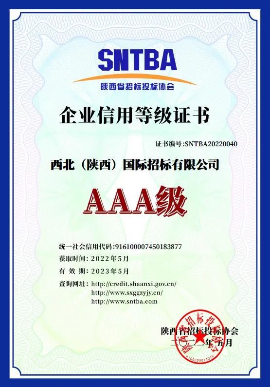 熱烈祝賀我公司榮獲2022年陜西省招投標(biāo)協(xié)會(huì)《AAA級(jí)企業(yè)信用等級(jí)證書》