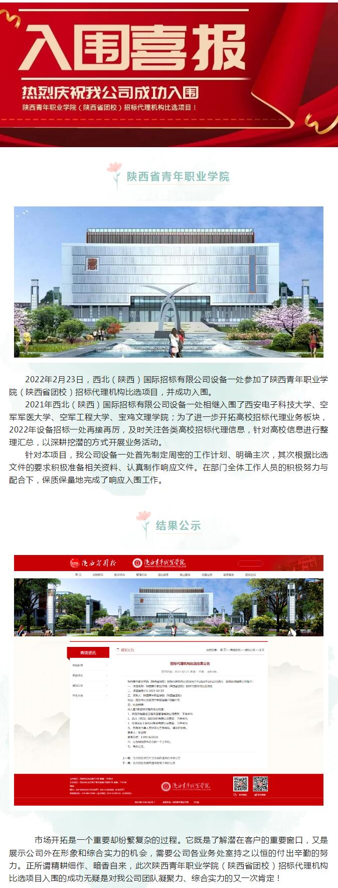 西北(陜西)國際招標有限公司成功入圍陜西青年職業學院(陜西省團校)招標代理機構比選項目