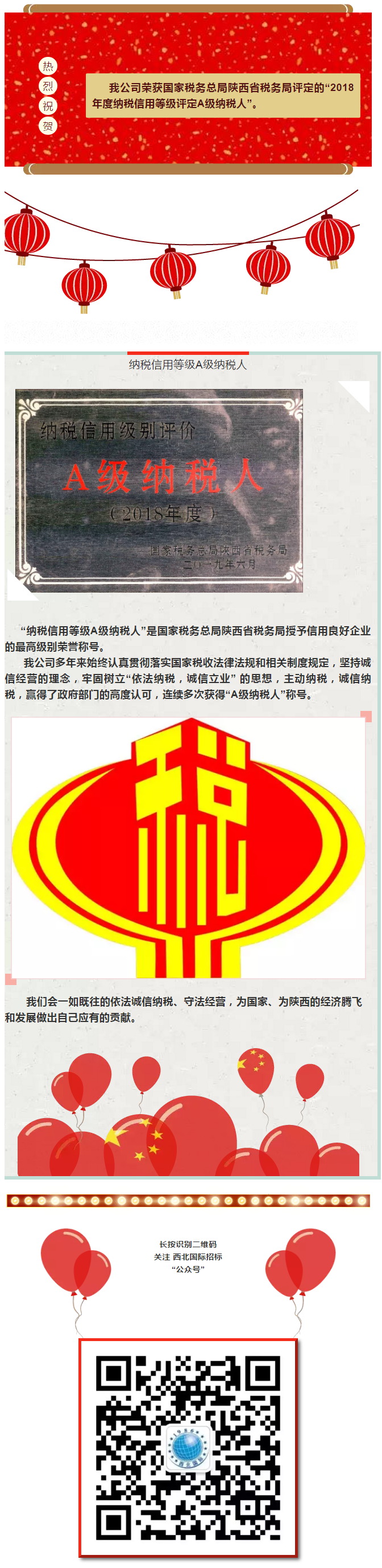 熱烈祝賀我司榮獲“2018年度納稅信用評(píng)價(jià)A級(jí)納稅人”