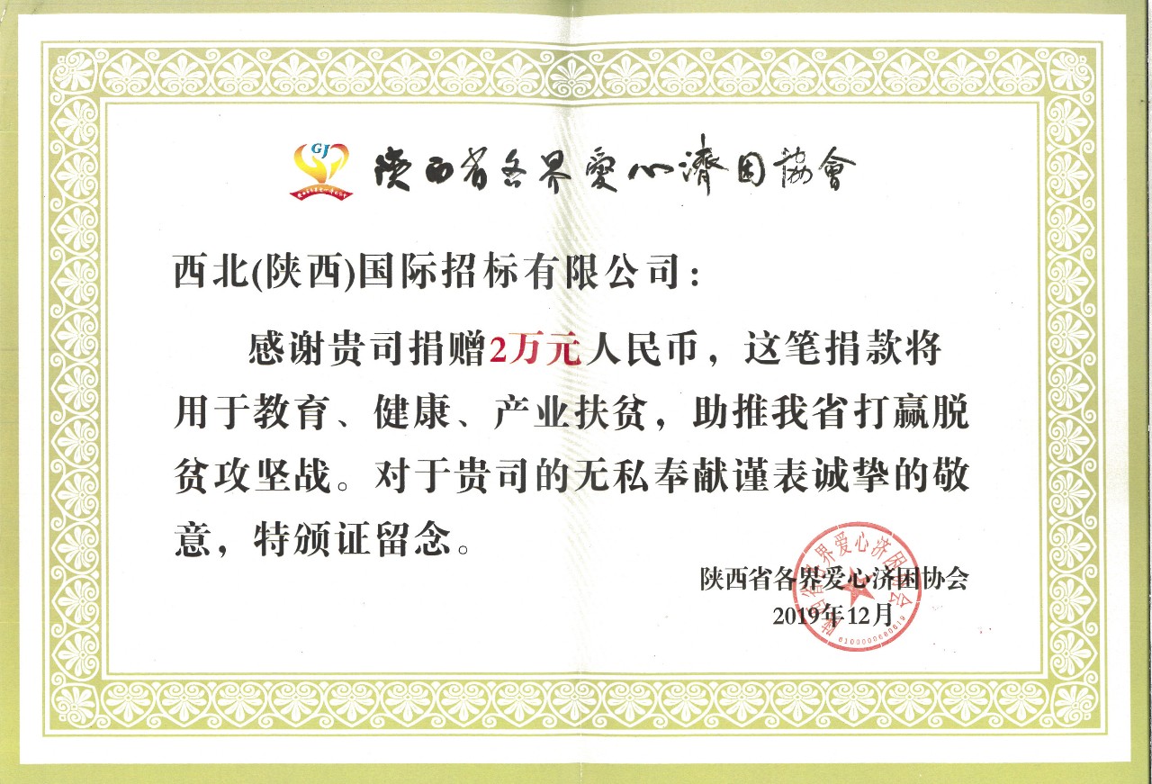 我公司向“陜西省各界愛心濟(jì)困協(xié)會”捐款2萬元