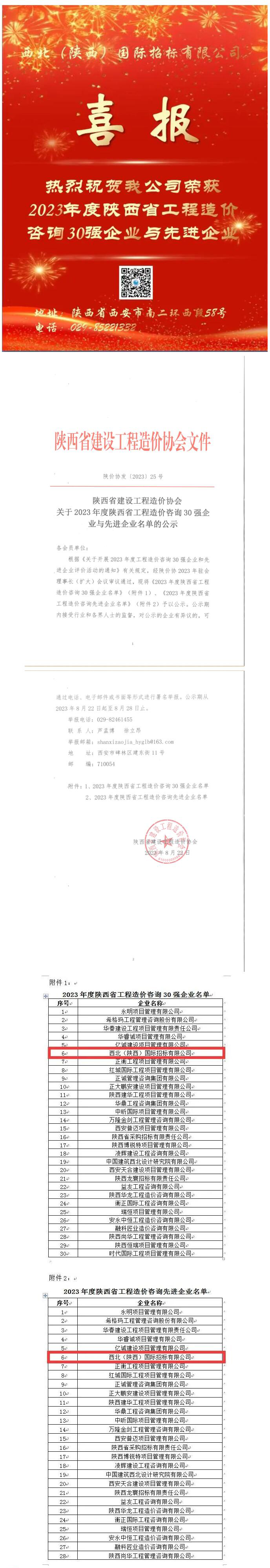 熱烈祝賀我公司榮獲2023年度陜西省工程造價咨詢30強企業與先進企業