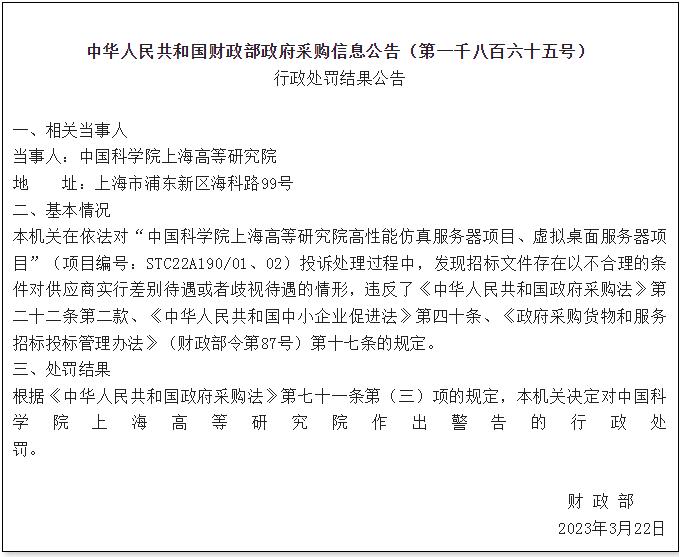 3月28日,財政部發(fā)布1865號公告,涉及項目為“中國科學院上海高等研究院高性能仿真服務器項目、虛擬桌面服務器項目”。