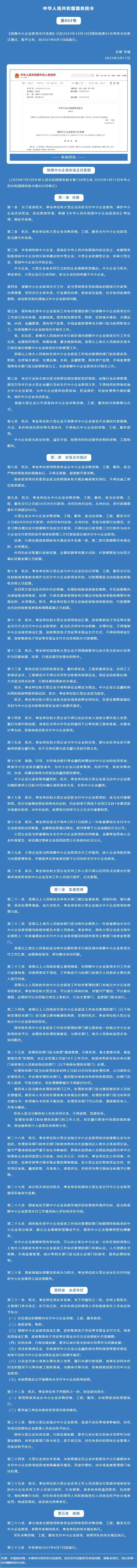 修訂后的《保障中小企業(yè)款項支付條例》發(fā)布!國務院令第802號