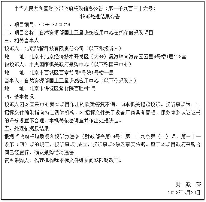 5月30日,財政部發布1936號政府采購處理意見,涉及項目為自然資源部國土衛星遙感應用在線存儲采購項目,預算 500 萬元。